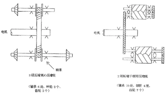 干螺桿壓縮機(jī)的兩根螺桿以面相對,因此它的特點是稍稍接觸便會形成面接觸,引起發(fā)熱膨脹,燒焦并卡死,而另一方面,離心式壓縮機(jī)最大的特點,是葉輪葉片與蝸殼是以線相對,因此即使發(fā)生若干接觸也是線接觸,葉片如刀片般劃過,不會燒焦。因此,它最大的優(yōu)點是事故比干式螺桿壓縮機(jī)要少得多。