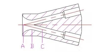 文丘里管型分流頭結(jié)構(gòu)十分簡(jiǎn)單,只有本體,不帶其它零部件,但加工困難。從熱力膨脹閥出口的制冷劑兩相混合物,由分流頭進(jìn)口A流經(jīng)收縮口B時(shí),雖流速較高,壓力降較大,但流線平順,不與管壁脫離,使氣液兩相流體均勻地進(jìn)入圓環(huán)形流道C中,由于管內(nèi)收縮與擴(kuò)張段采用平滑過(guò)渡,制冷劑在整個(gè)流動(dòng)過(guò)程中不產(chǎn)生紊流,所以文丘里管型分流頭阻力較小,對(duì)安裝位置無(wú)特殊要求。