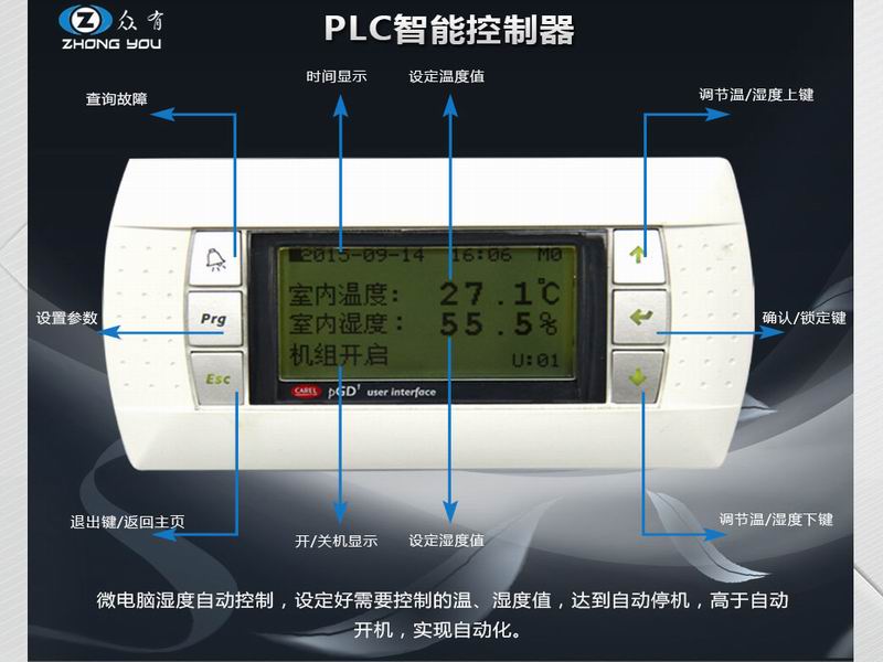風(fēng)冷降溫型除濕機(jī)采用高性能可編程控制儀表??刂凭雀?,可靠性好。該儀表 預(yù)留有遠(yuǎn)程控制接口,可方便用戶遠(yuǎn)程集中控制,節(jié)省管理人力。